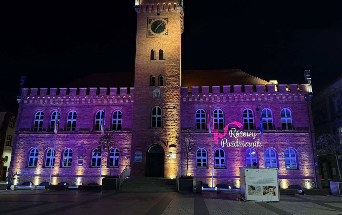 Październik jest miesiącem świadomości raka piersi, o czym przypomina napis na elewacji szczecineckiego ratusza.