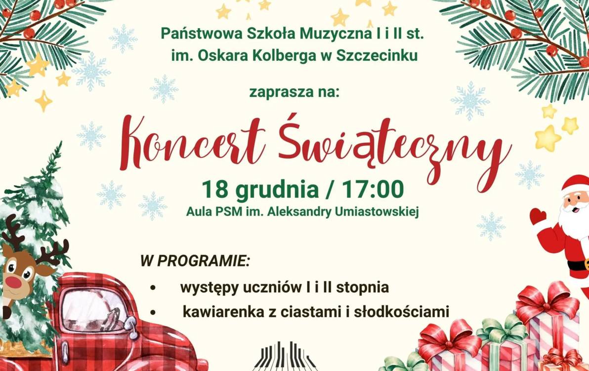 Już w czwartek (18 grudnia) Państwowa Szkoła Muzyczna w Szczecinku zaprasza na koncert świąteczny. Wystąpią uczniowie szkoły I i II stopnia Początek o godzinie 17 w auli, czynna będzie także kawiarenka ze słodkościami. Wstęp wolny.