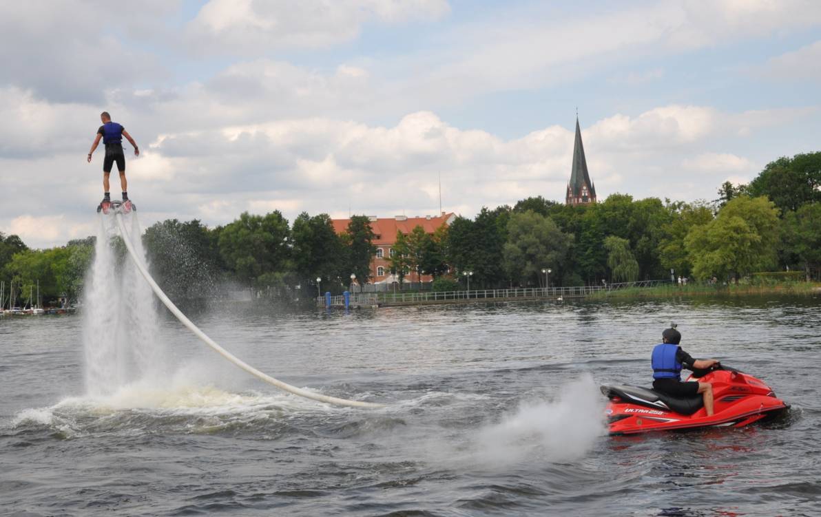Balony powinny wzbić się w powietrze o godzinie 19 (prosimy śledzić bieżące informacje na facebooku miasta Szczecinek i SAPiK), ale wcześniej (i później także), czekają nas widowiskowe pokazy na jeziorze Trzesiecko. O godzinie 18 w rejonie pomostu koło szczecineckiego zamku startuje Flyboard Freestyle Show! To efektowne akrobacje w powietrzu flyboardzistów unoszonych przez… strumień wody.