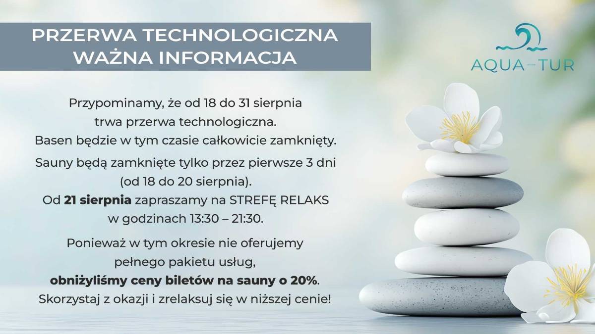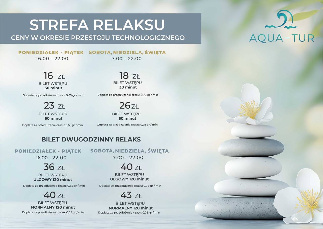 Ważne! Strefa Relaks (sauny) jest nieczynna tylko trzy dni – od 18 do 20 sierpnia, pozostałe dni do końca przerwy Strefa jest dostępna od godziny 13:30 do 21:30. W tych dniach wejście do Strefy będzie o 20 procent tańsze.