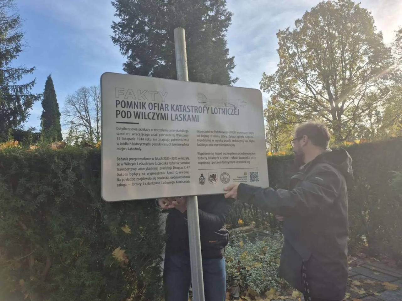 Tuż przed Wszystkimi Świętymi na szczecineckim cmentarzu przy pomniku lotników, który w roku 1944 zginęli w katastrofie lotniczej koło Wilczych Lasek pojawiła się tablica informacyjna o poniższej treści: