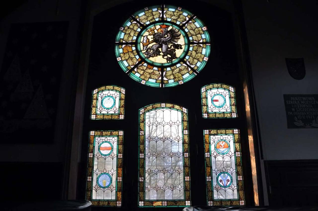 Podobnie zresztą jak na pięknym witrażu w auli Szkoły Muzycznej w dawnym gmachu landratury z początków XX wieku.