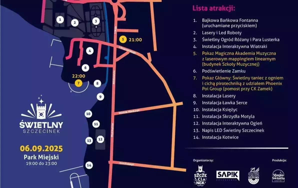Czekać na Was będą m.in.: odmienione światłem przestrzenie parku, interaktywne instalacje świetlne w różnych punktach szczecineckiego parku. Do tego bajkowa, bańkowa fontanna, podświetlony Zamek oraz pokaz z laserowym mappingiem. Zapraszamy mieszkańców Szczecinka i przyjezdnych na wyjątkowe wydarzenie, które rozświetli nasze miasto tysiącami kolorów. Cała parkowa przestrzeń od muszli koncertowej po wyciąg nart wodnych będzie tętnić życiem, światłem i kolorami. Już od godzin popołudniowych, ale kulminacja festiwalowych wydarzeń zacznie się od godziny 19 i potrwa aż do 23.