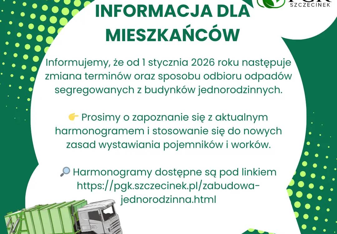 Przedsiębiorstwo Gospodarki Komunalnej w Szczecinku informuje, że od 1 stycznia 2026 roku zmieniają się terminy i sposoby odbioru odpadów posegregowanych z budynków jednorodzinnych.