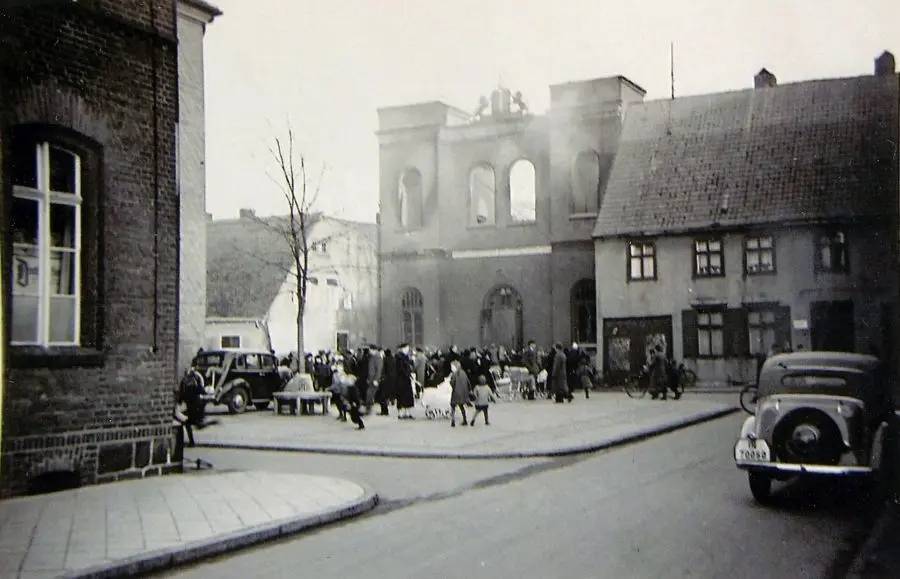 To jedno z najbardziej przejmujących zdjęć przedwojennego Szczecinka. Przedstawia spaloną podczas Nocy Kryształowej synagogę.