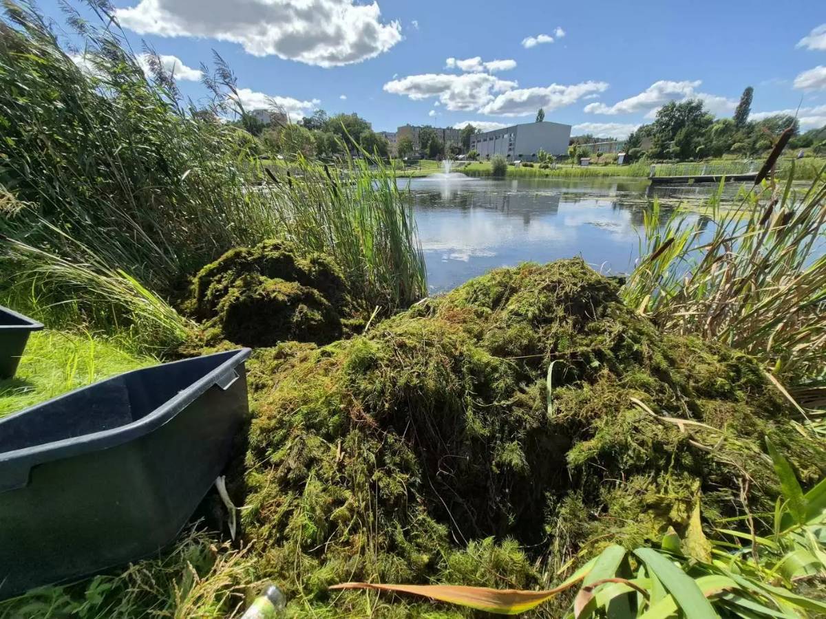 Staw w strefie rekreacji przy osiedlu Kopernika w Szczecinku jest oczyszczany z roślinności wodnej.