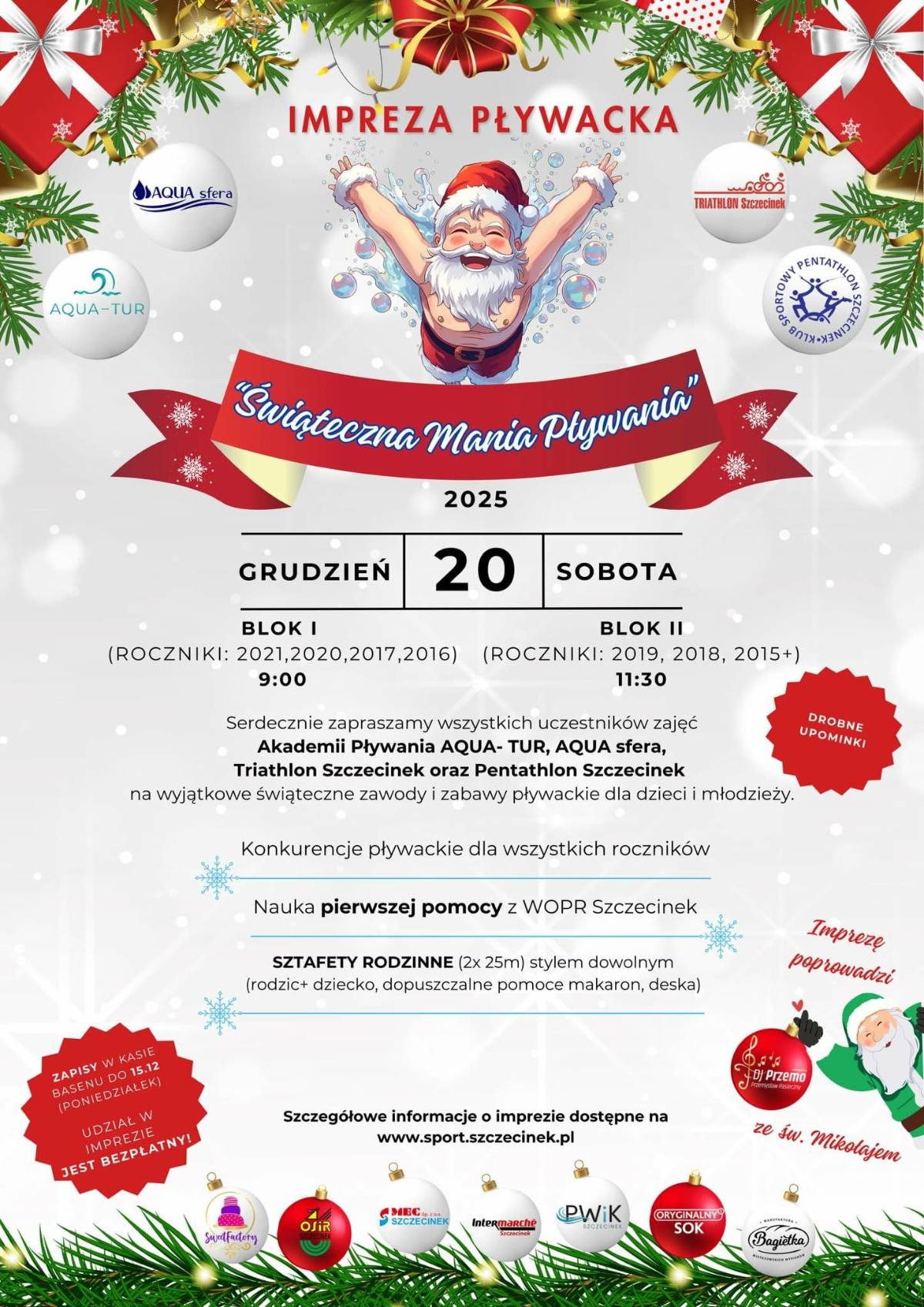 Ruszyły zapisy na Świąteczną Manię Pływania 2025. W sobotę (20 grudnia) na dzieci trenujące pływanie w klubach w klubach na basenie Aqua Tur w Szczecinku czeka moc atrakcji.