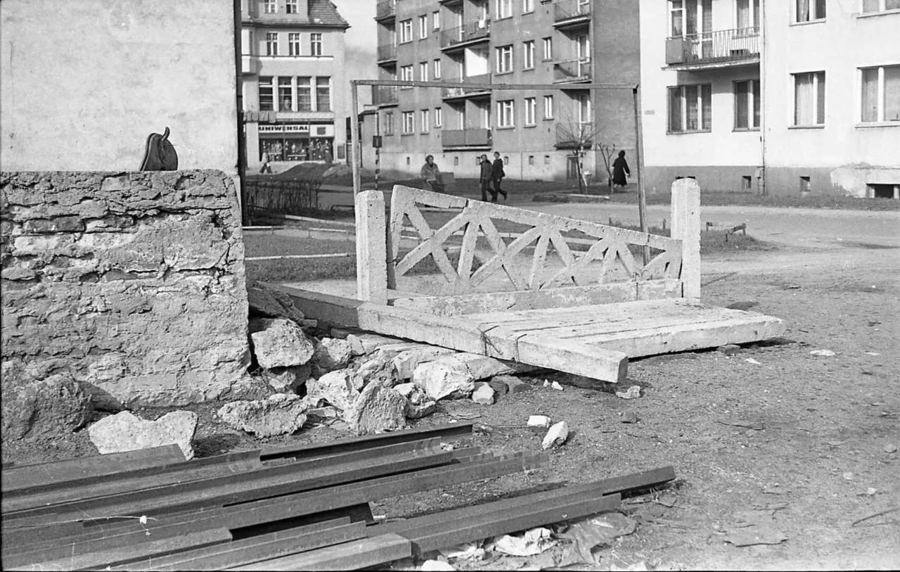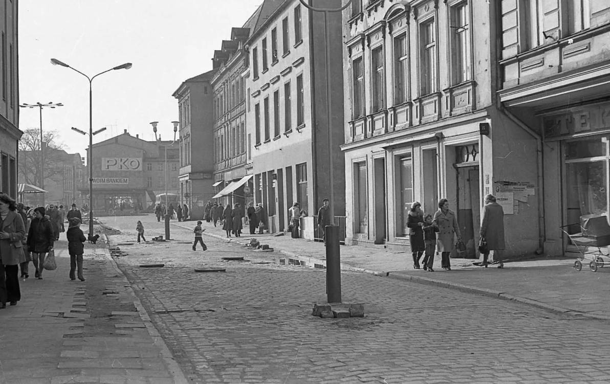Dziś pokazujemy wybór kilkunastu obrazów z ostatnich dekad Polski Ludowej miasta nad Trzesieckiem. Wielu zaskoczy na pewno widok deptaka – ówczesnej ulicy 9 Maja (dziś Bartoszewskiego). Fotograf uchwycił ostatnie momenty, gdy ulica była jeszcze udostępniona do ruchu kołowego. Wyłożona była kamiennym brukiem, a piesi przemieszczali się chodnikiem. Ale ma środku bruku stoi już latarnia, bo za chwilę jedna z głównych arterii Szczecinka będzie dostępna tylko dla pieszych.