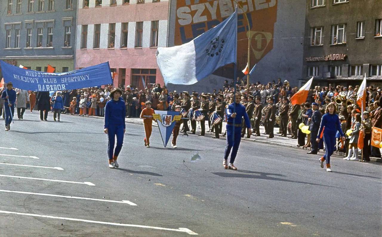 Mamy i przemarsz reprezentacji klubu Darzbór na pochodzie 1-majowym, kolumna sportowców defiluje przed trybuną honorową na „schodkach” przy Żukowa (lub – jak to się mawiało – na Żukowej). W tle widzimy kultową cukierenkę Adria.