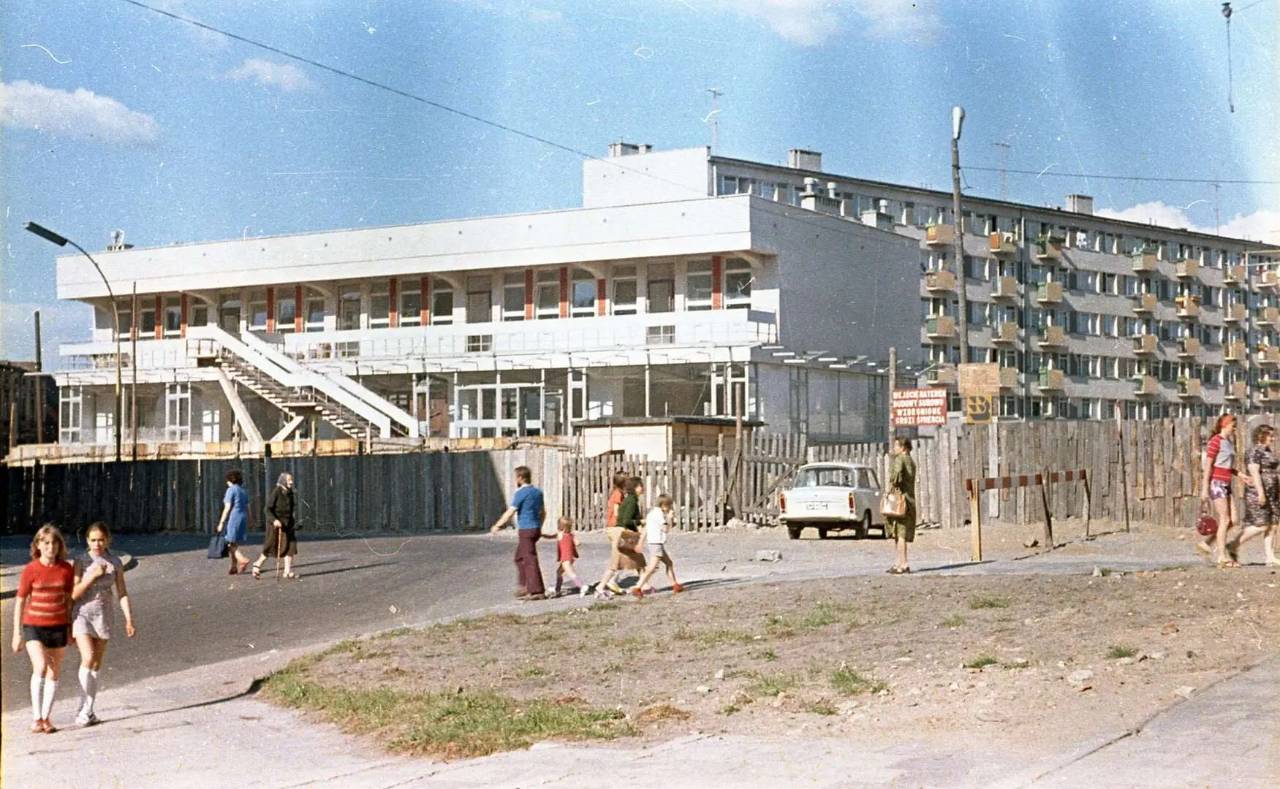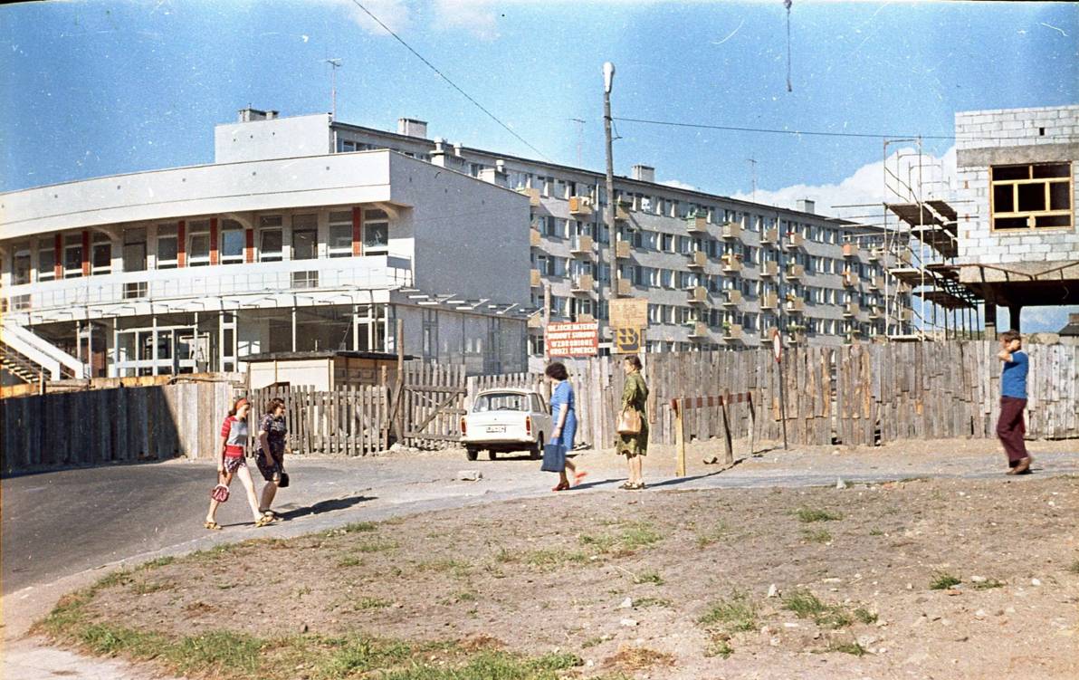 Co widzimy? Końcowy etap budowy dwóch – nowoczesnych na tamte lata – pawilonów handlowych na ówczesnej ulicy Żukowa. Dziś w jednym jest m.in. biblioteka miejska, w drugim PZU. Wielu mieszkańców Szczecinka pamięta, że w Polsce Ludowej działa tam Składnica Harcerska. Budynki wyróżniały się na tle toporniej architektury PRL-owskich blokowisk i wszechobecnej prowizorki: sklepów-bud skleconych tyle jak i gdzie popadnie.