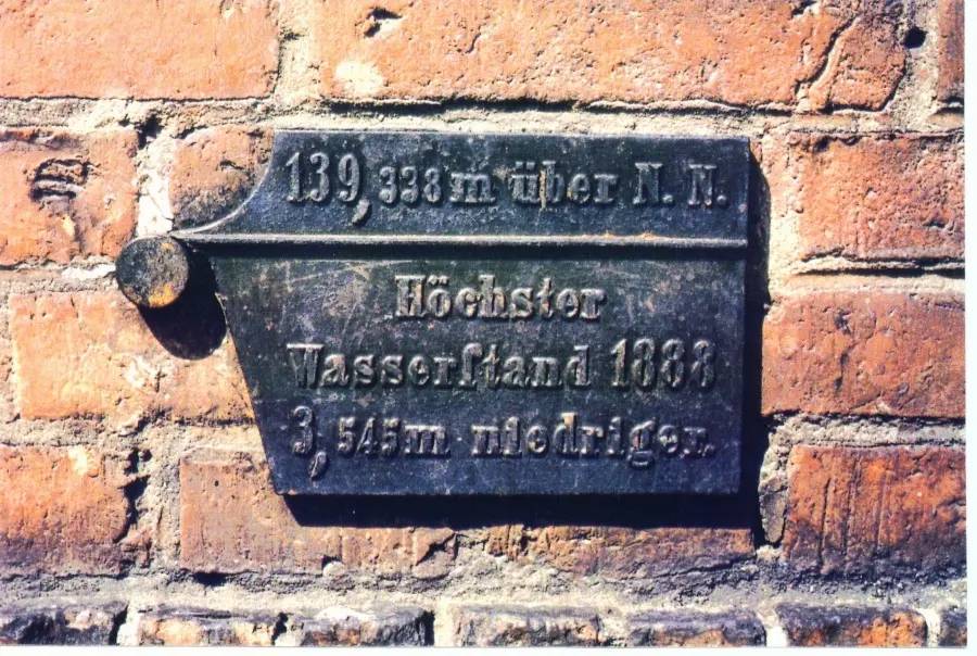 Co mogło zmylić autora polskiej tabliczki? Być może po prostu źle ją przetłumaczono. Albo uznano, że to dość pokrętne wyznaczenie stanu wiosennego potopu – trzeba bowiem przyznać, że w roku 1888 cały region faktycznie dotknęły liczne powodzie. Dlaczego po prostu, co robi się zwykle, nie zaznaczono miejsca dokąd sięgnęła wówczas woda, a zdecydowano się wytyczyć go odejmując te nieco ponad 3,5 metra od wysokości repera? Przypuszczamy, że najpewniej nie dałoby się jej zaznaczyć na żadnym reprezentacyjnym budynku, bo faktycznie poziom wody był znacznie niższy.