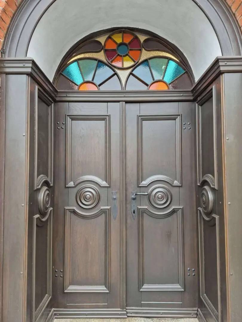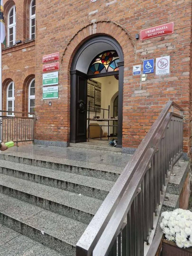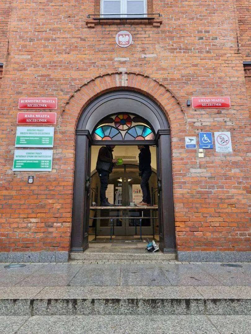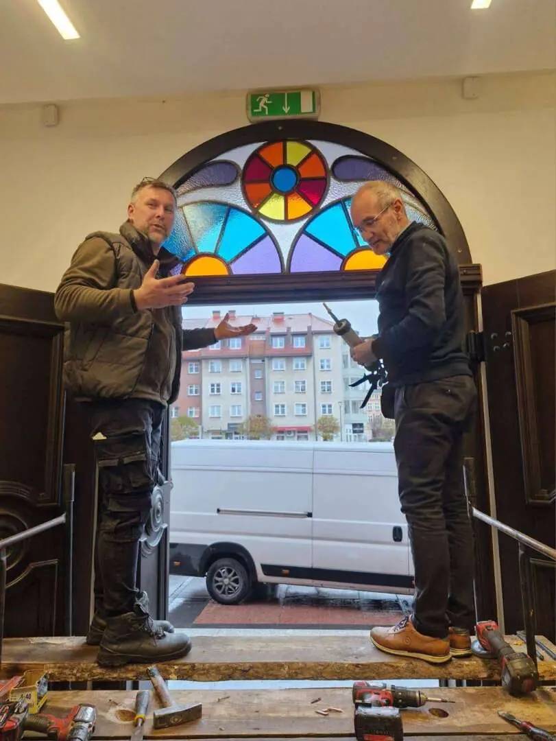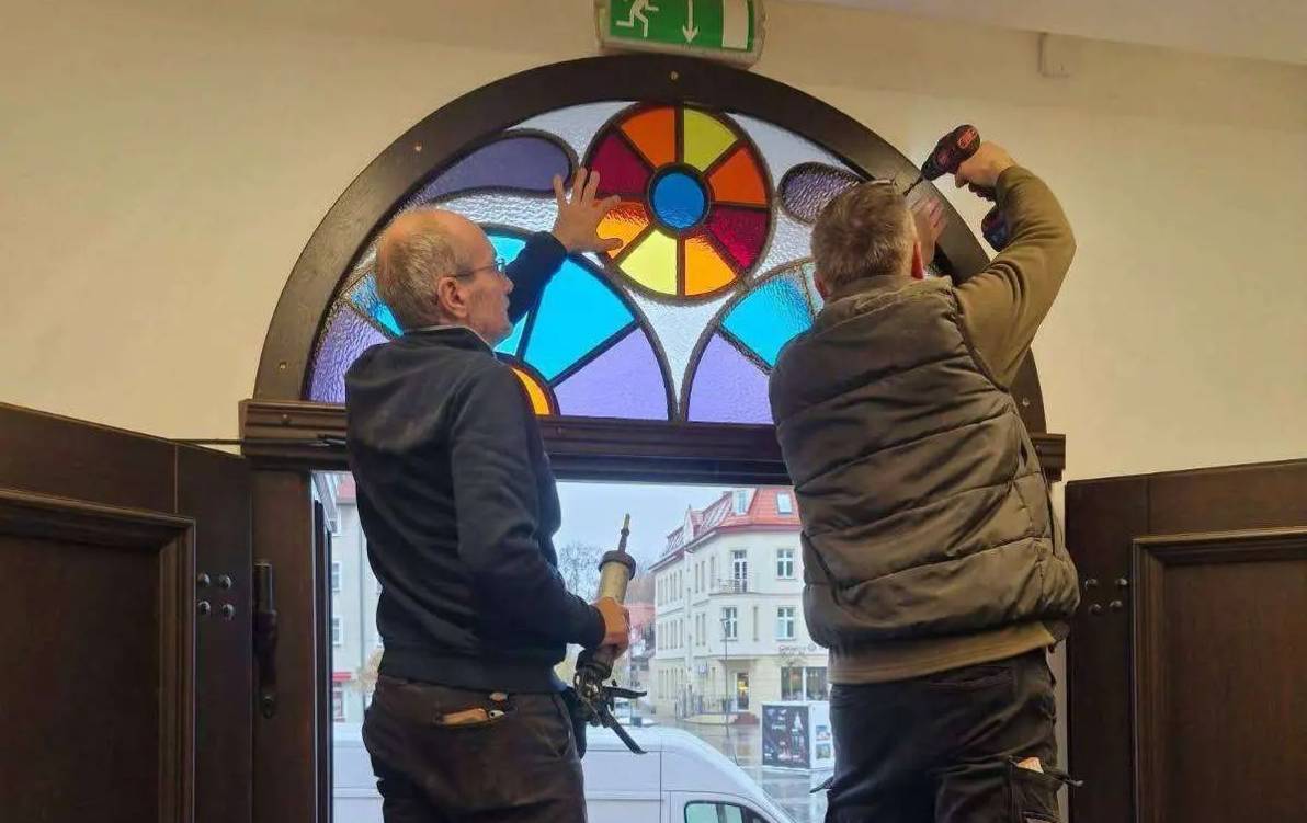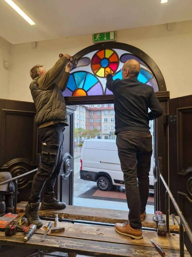 Wymiana drzwi do szczecineckiego magistratu została ukończona – portal drzwiowy ma już kolorowy witraż.