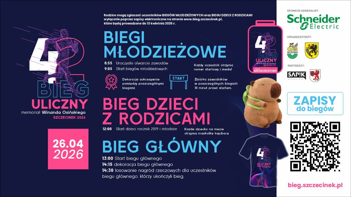 Miłym zwyczajem szczecineckich biegów ulicznych jest uhonorowanie małych biegaczy na mecie biegu dzieci z rodzicami upominkiem. W tym roku organizatorzy zdecydowali się na maskotkę – pluszową kapibarę. Nie tylko dlatego nie warto zwlekać z rejestracją, bo obowiązuje limit 550 uczestników, a zostało już nieco mniej niż 100 miejsc. Radość ze wspólnego startu i wpajanie od małego zamiłowania do aktywności są bezcenne, a więc gorąco zachęcamy do biegania nie tylko w imprezach masowych.