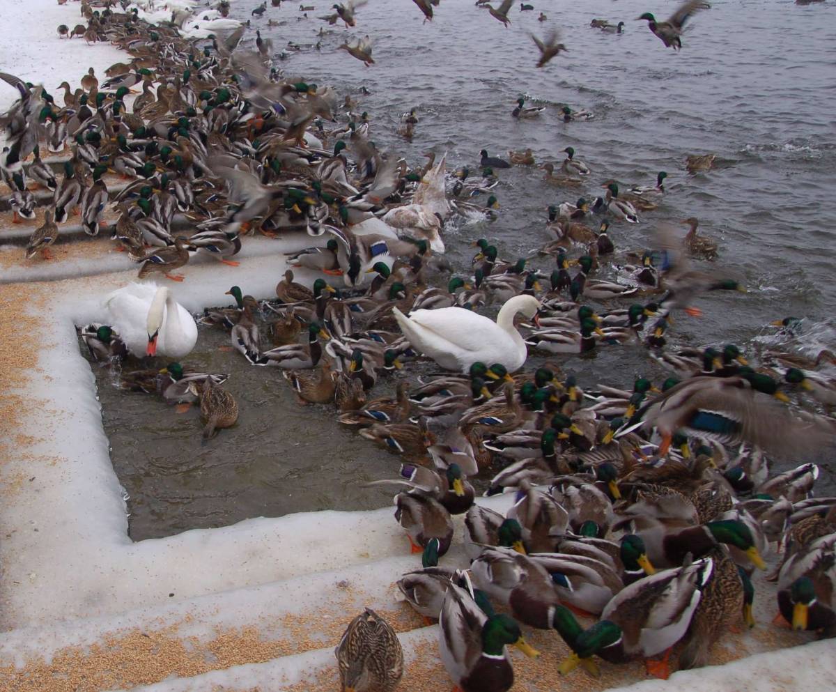 Pracownicy Przedsiębiorstwa Gospodarki Komunalnej na zlecenie ratusza każdego dnia sypią w tych miejscach kilkadziesiąt kilogramów ziarna pszenicy. Wielu mieszkańców Szczecinka dokarmia także ptaki na własną rękę – dziękujemy. Dokarmianie ptaków w zimie – zwłaszcza tak mroźnej – to konieczność, bo te z Trzesiecka uzależniły się od pomocy ludzi. „Chodzenie na kaczki” to rytuał spacerów mieszkańców Szczecinka, którzy najczęściej dają im suchy chleb. To niezbyt odpowiedni pokarm dla tych zwierząt, ale nikt nie ma mocy zmienić tego zwyczaju ani z nim walczyć. Jeżeli już dajemy ptakom chleb, to dbajmy chociaż, aby nie był spleśniały. Takie pożywienie powoduje chorobę zwaną kwasicą i biegunki.