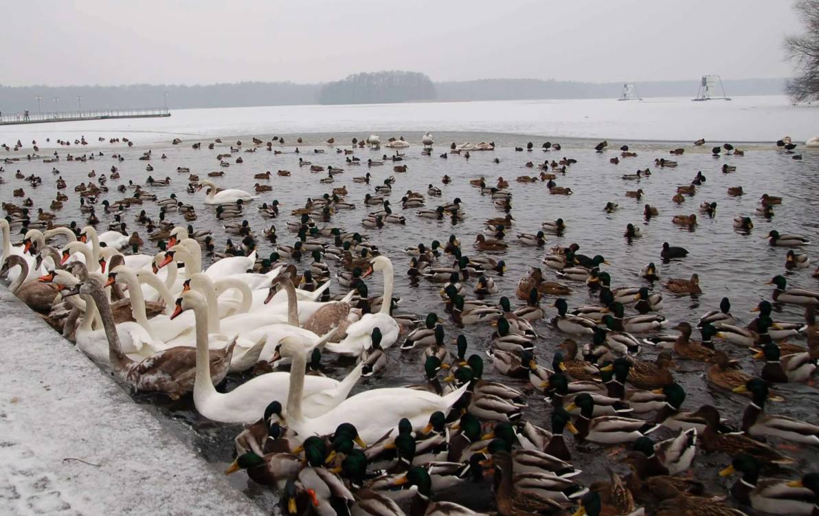 Temperatury spadające przy gruncie do minus 20 stopni trwające już ponad miesiąca sprawiły, że jezioro w Szczecinku pokryła gruba warstwa lodu. Jedynie u wylotu Trzesiecka do Niezdobnej jest skrawek niezamarzniętej wody (a także koło Wyspy Łabędziej, gdzie stado ptaków nie dopuszcza do zamarznięcia małego fragmentu), gdzie gromadzą się tysiące ptaków.