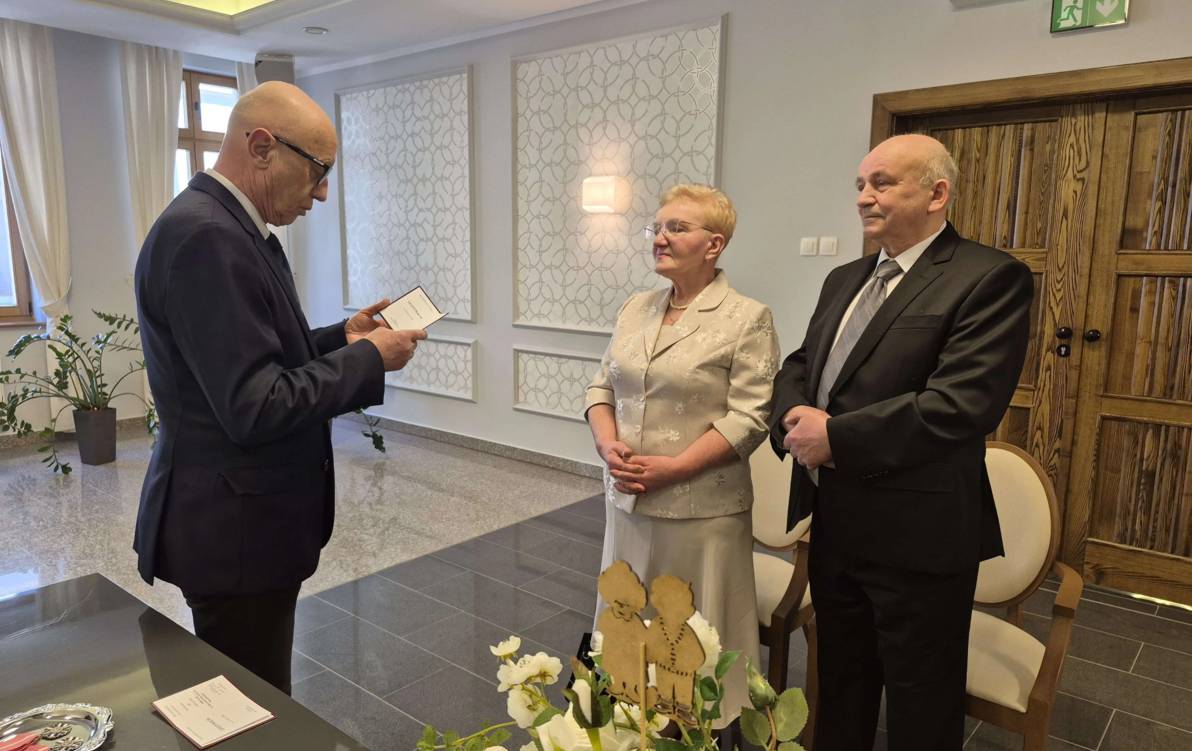 Złote Gody bliscy Państwa Anny i Stanisława Lis obchodzili więc oficjalnie teraz w USC szczecineckiego rausza. Okazją było wręczenie prezydenckich medali za długoletnie pożycie małżeńskie, które wraz z życzeniami i bukietem kwiatów przekazał burmistrz Szczecinka Jerzy Hardie-Douglas. Do życzeń dołączyła się kierowniczka Urzędu Agnieszka Frątczak.